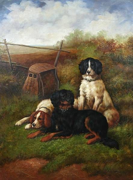 A pair, gundogs at ease by a tree and gundogs before a landscape