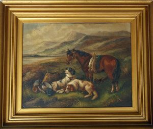 Horses and dogs resting in a hilly landscape