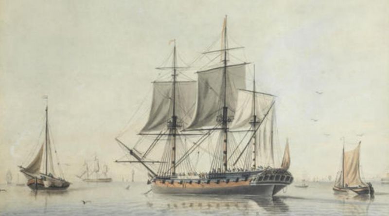 | Shipping in a calm with an anchored frigate inshore drying her sails | |