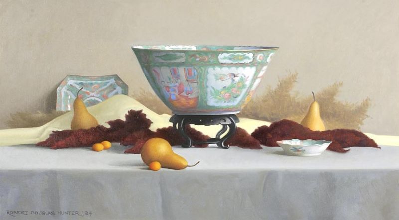 | Arrangement with Rose Medallion. Still life of three pieces of Rose Medallion, pears, kumquats, and red sumac. | |
