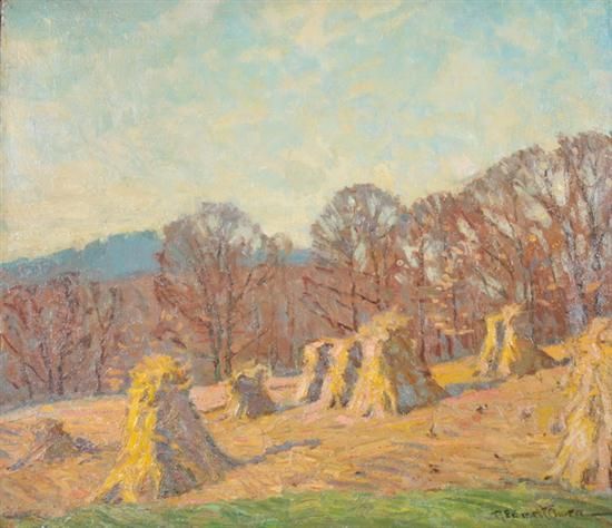 VIEW OF GOLDEN HAYSTACKS IN A MEADOW