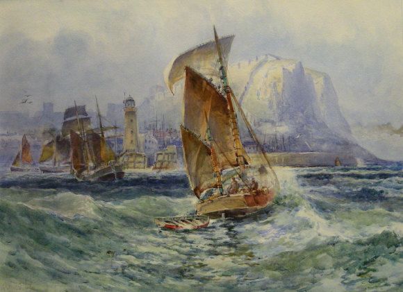 Boats under sail approaching Scarborough Harbour