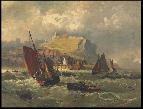 | COASTAL SCENE WITH FISHING BOATS IN STORMY WATERS | |