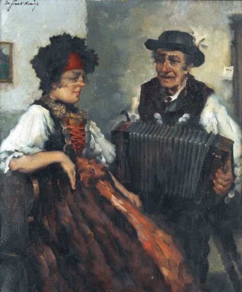 Interieur mit Akkordeonspieler und Trachtenfrau.