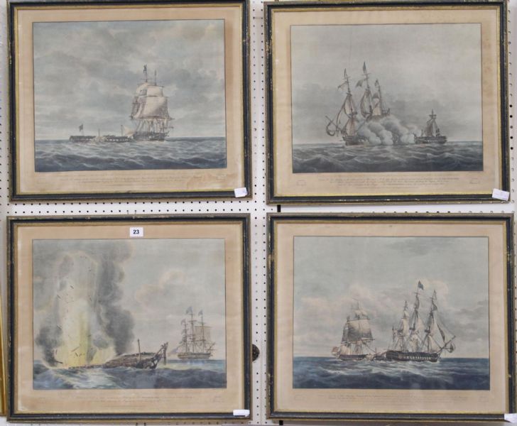 A set of four prints showing engagements between HM Frigate "Java" and others