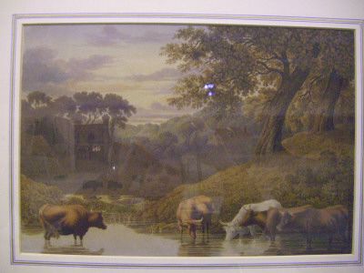 Pastoral landscape with cattle watering