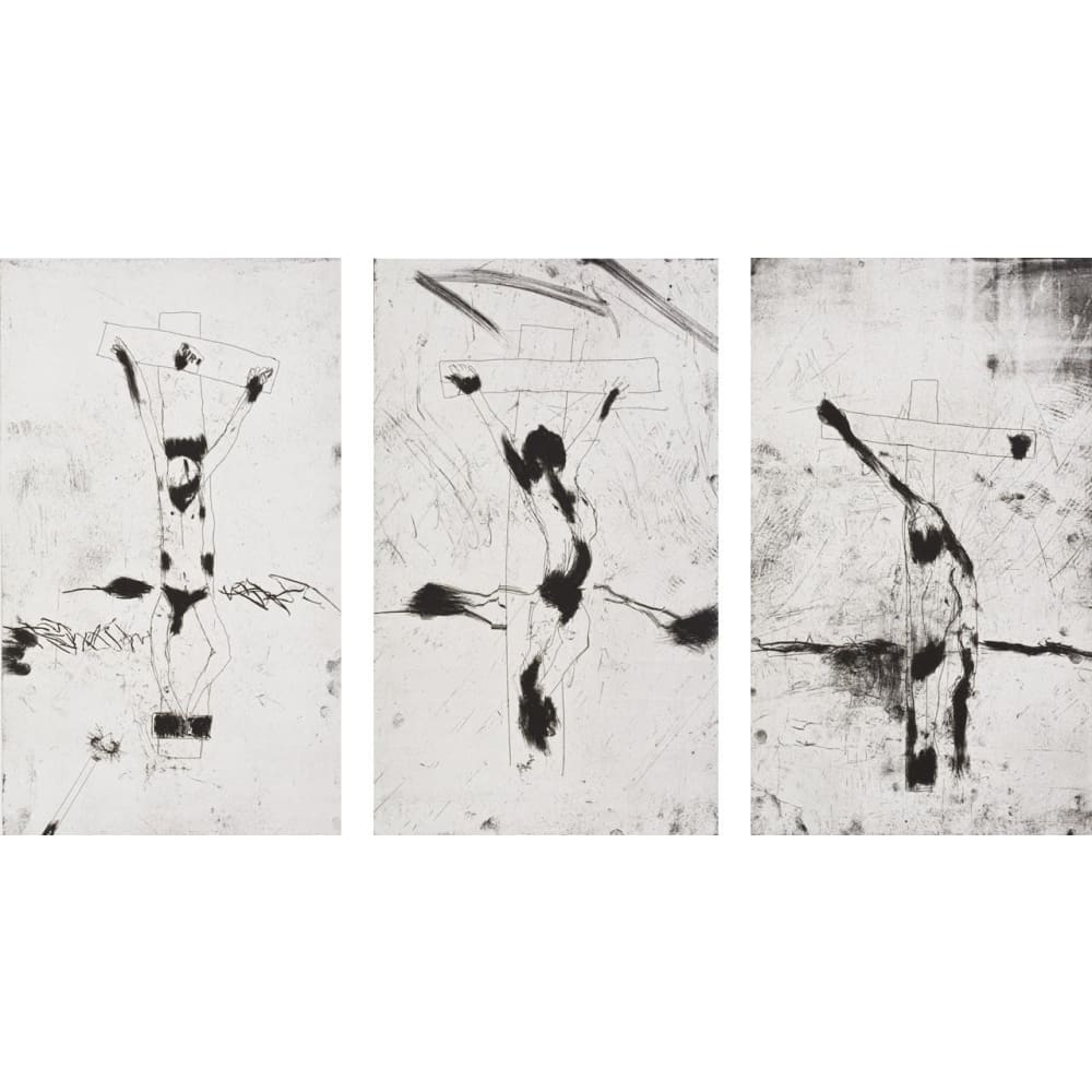 each plate size: 57,5 by 34,5cm; each sheet size: 75 by 48cm, unframed, numbered 18/20 in pencil, inscribed with the title (King of the Jews; The Bad Thief; The Good Thief) and embossed with the Timothy Foulds Print Studio chopmark in the margin | |