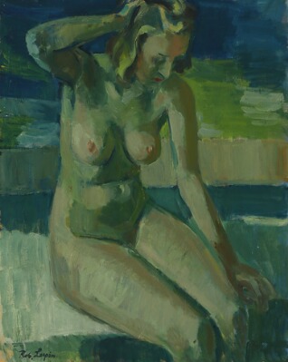 Sitting nude woman model in green surroundings