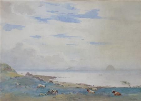 CATTLE GRAZING WITH THE BASS ROCK IN THE DISTANCE