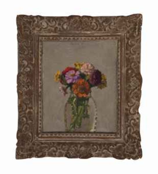 | Zinnias in a Glass Jar, on a Light Grey Background | |