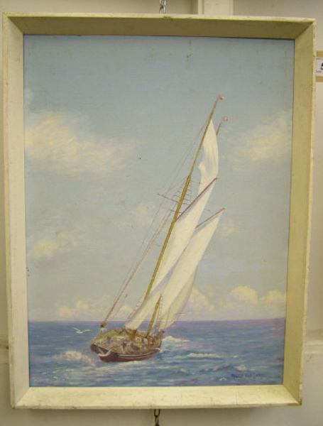 A gaff-rigged fishing boat sailing in a stiff breeze.