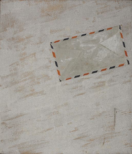 Aluminum paint and collaged envelope on canvas