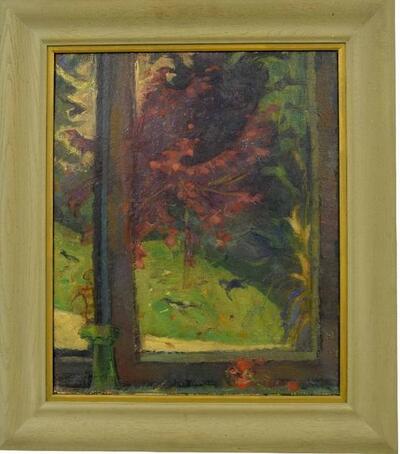 | View from a Window into a Garden showing a figure, cat and birds | |