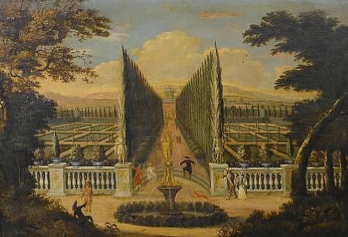 | A formal house and garden with elegant figures resting beside a fountain before an avenue of cypress trees | |