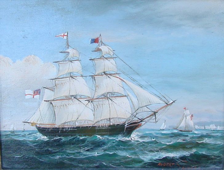 Bark sailing in foreground with ships in the distance