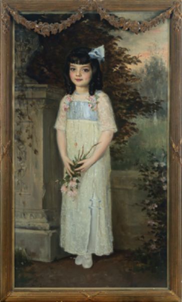 Portrait of a young girl with a hair bow and a bouquet of flowers