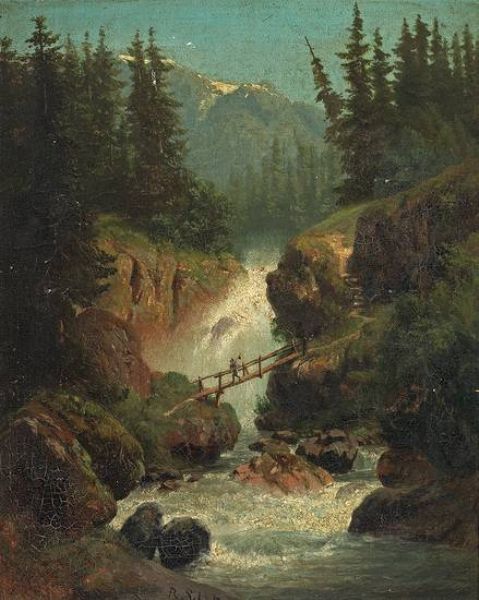 Hochgebirgslandschaft mit Katarakt, hölzernem Steg und Figurenstaffage