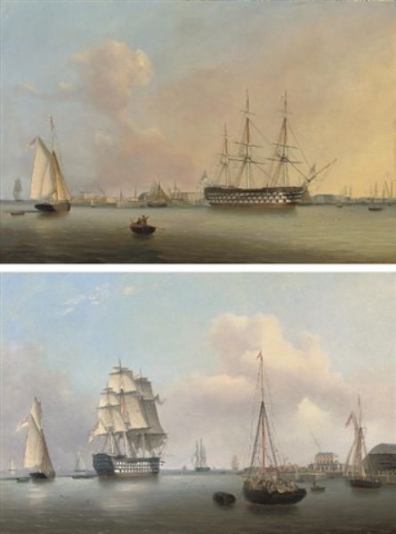 | Two magnificent First Rates: H.M.S. Trafalgar and H.M.S. Queen lying off the Royal Dockyard at Sheerness | |
