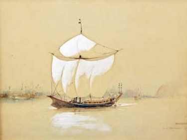 | A barge in full sail with cannon, the distant treelined shore with temple roofs | |
