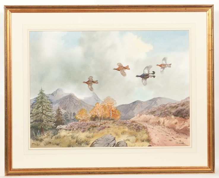 BLACK COCK AND HIS GREY HENS IN FLIGHT