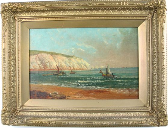 Coastal scene with fishing boats in foreground,