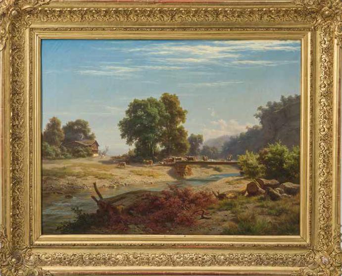 | Bachlandschaft mit Kuhherde und Ziegen beim Überqueren einer kleinen Brücke | |