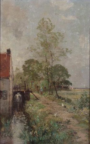 Bäuerin bei einer Wassermühle in einer sommerlichen Landschaft