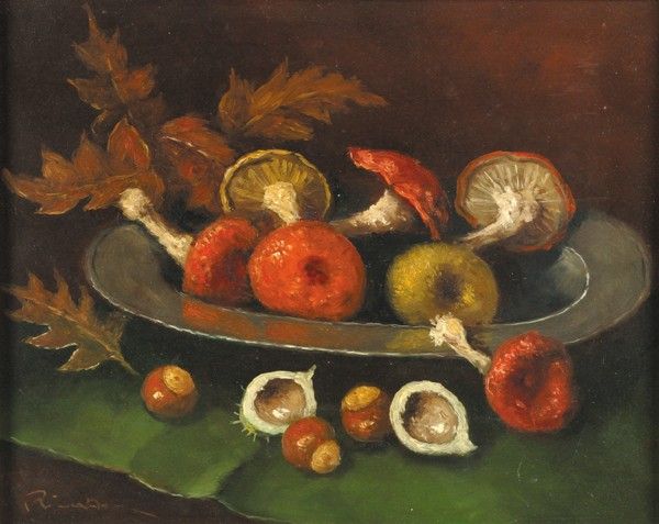 Stilleven met paddestoelen, kastanjes en bladeren op een tinnen schotel