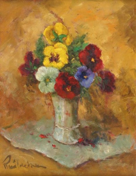 Stilleven met veelkleurige viooltjes in een vaasje