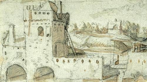 Pencil pencil and black chalk and brown and greenish wash on paper