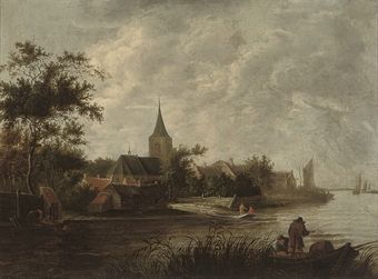 | A river landscape with fishermen in their boats and figures on a ferry, a church beyond | |