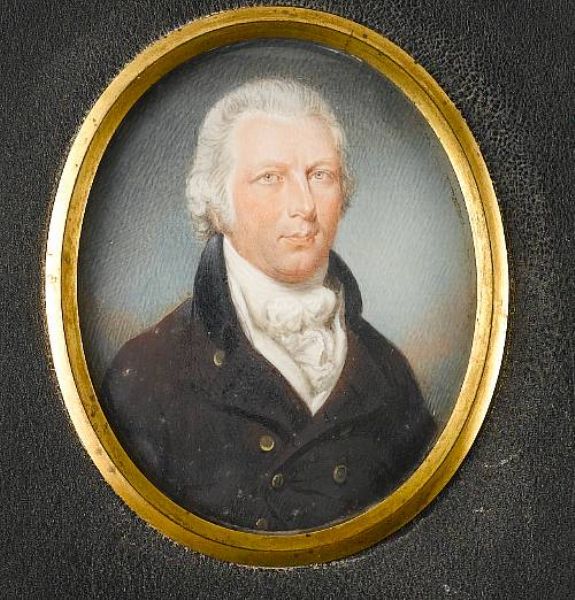 | Mr Hathorn, wearing brown coat with black collar, white waistcoat, frilled chemise and tied cravat, his hair powdered | |