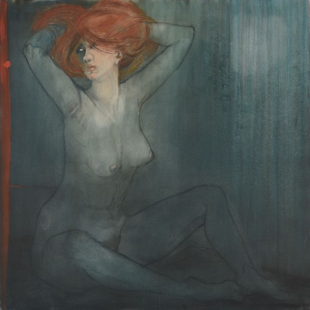 Femme rousse nue assise sur fond bleu-nuit.