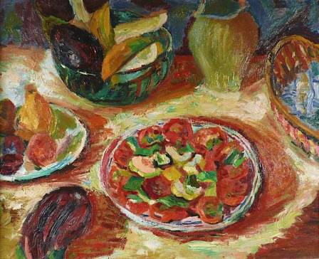 NATURE MORTE AUX AUBERGINES ET COUPE DE FRUITS