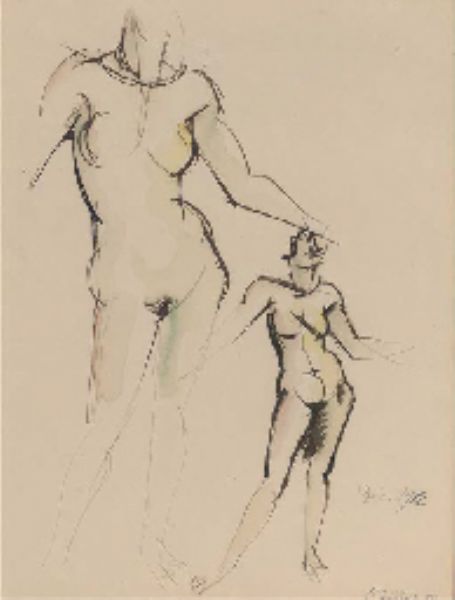 Pen black ink and watercolour on paper