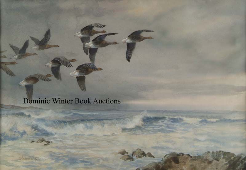 | Pinkfeet Geese flying over breaking waves by the shore | |