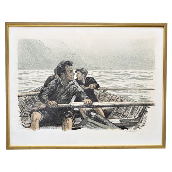 Motiv av män i roddbåt.