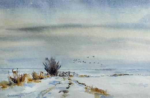 Geese Flying over Snow, Norton Marsh, Norfolk