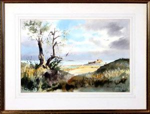 View of Bamburgh Castle and the Farne Islands from a hill to the North West.