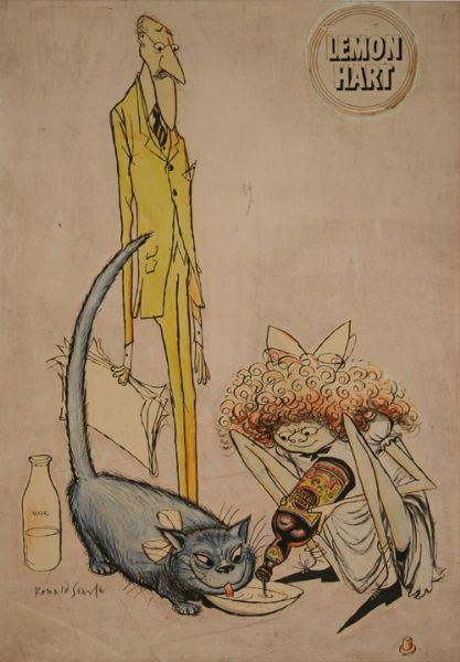 | Advertising Cartoon for Lemon Hart Rum with a Man watching a Girl pouring a Saucer of Rum for her Cat | |