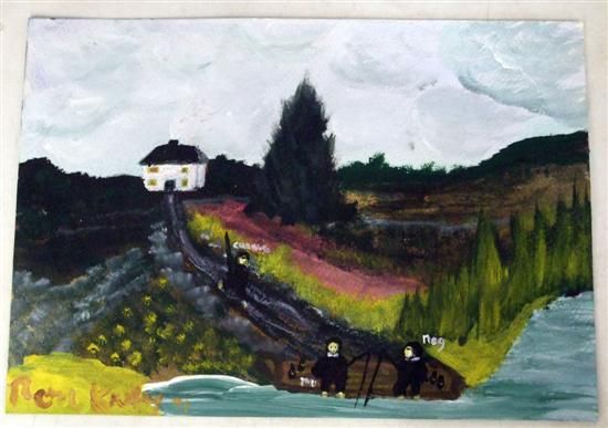 | Landscape of Ron and Reggie Kray fishing with older brother Charlie Kray walking towards a house | |