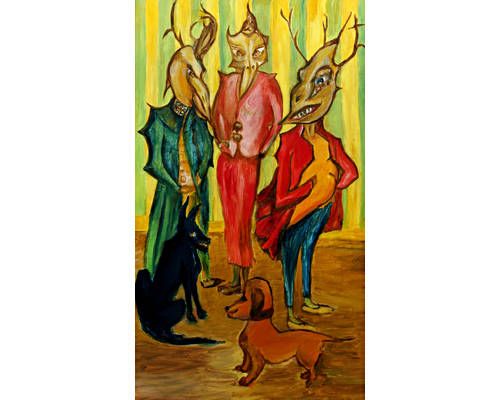 | Three grotesque figures with dogs, believed to represent the Kray brothers with censor stamps | |