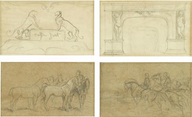 | ARCHITECTURAL LION ORNAMENTS; MANTLEPIECE FLANKED BY FIGURES; GROUP OF HORSES FACING RIGHT WITH RIDER; and HORSES AND RIDERS FAC | |
