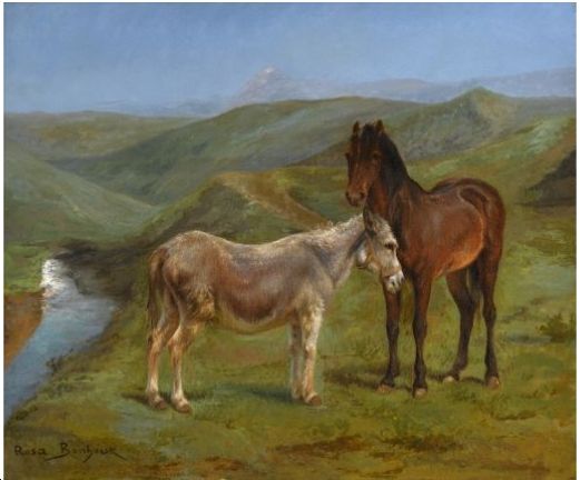 PONY AND A DONKEY IN A HILLY LANDSCAPE
