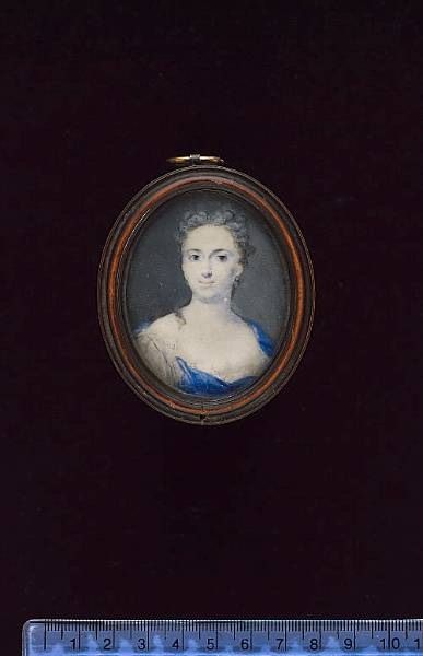 | A Lady, wearing blue and white robes, white lace underslip and pearl cluster earrings, her hair powdered and falling over her ri | |
