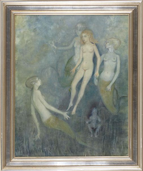 Depicts mermaids at the bottom of the sea with Neptune and a figure of a nude woman.