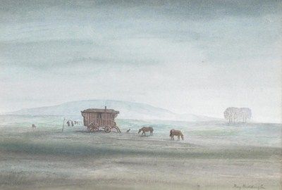 Gypsy caravan on a moor; A figure on a moor