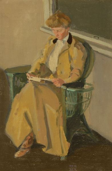 Full-length portrait of a woman in a yellow outfit sitting in a green wicker-type chair