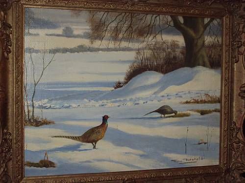 Pheasants in snow, and another pheasants in a field in summer