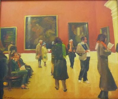| An interior of the Royal Academy, London, with people viewing other work against the characteristic red walls | |